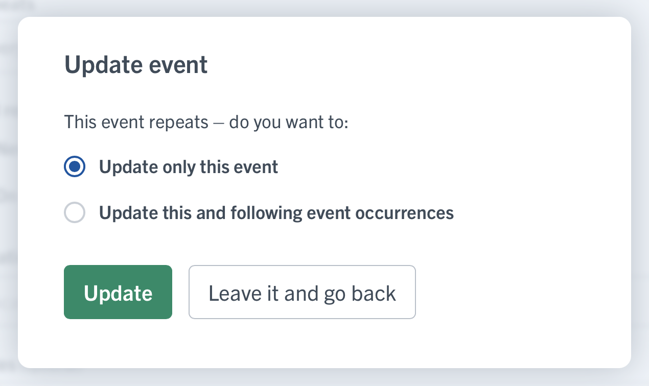 When you make changes or delete an event that repeats, you'll be asked to choose whether your changes should be applied to just that event on that day or time, or all following events.